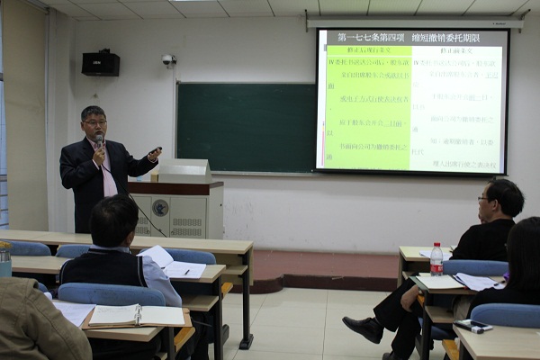 首先,林国全教授梳理台湾“公司法”的历史和发展过程,然后主要从2011-2013台湾“公司法”修改前后的对比来进行深入讲解。2011-2013台湾“公司法”共修改了28个条文,其中有些条文的修改是台湾“公司法”发展的重大突破,如第七条有关资本额之会计师查核签证的条款。公司设立登记时所需之会计师就资本额查核签证文件,由事前修正改为事后检送,这样的修改便于民众申请设立公司,可以说是相当大的改变。再如,第八条之增订第三项引进实质董事概念;第二十三条之增订第三项明定利益归入规范;第一百五十六条之订立撤销公开发行程序,同时删去商誉等等。林国全教授对台湾“公司法”的解读可谓独到,对最新修改的近30个条文的分析讲解也颇为深入透彻。