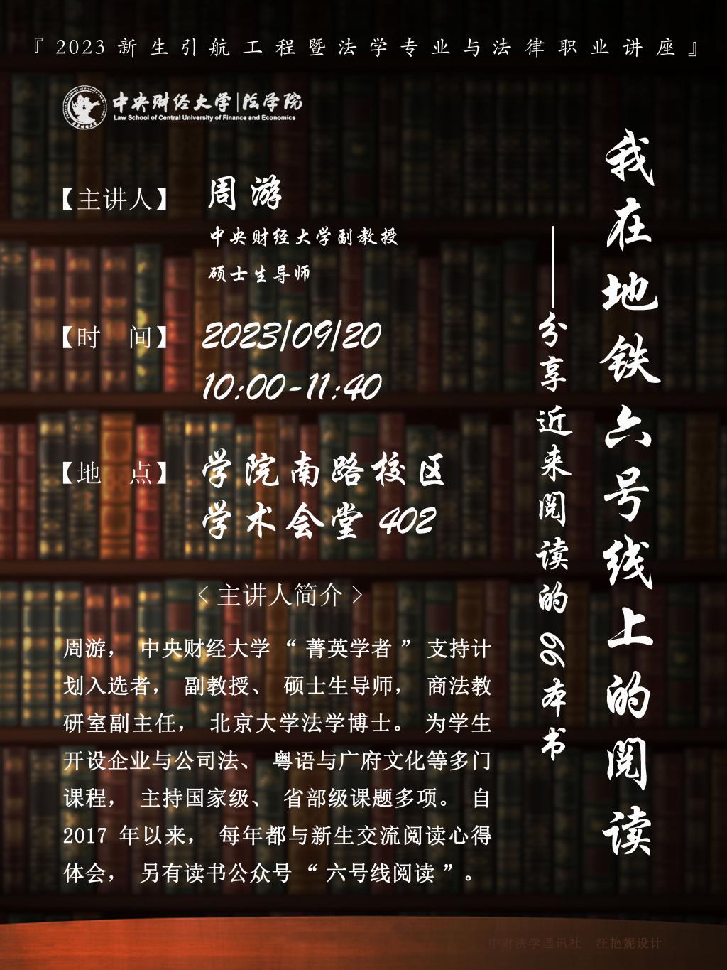 主讲人简介:周游,304永利集团“菁英学者”支持计划入选者,副教授、硕士生导师,商法教研室副主任,北京大学法学博士。为员工开设企业与公司法、粤语与广府文化等多门课程,主持国家级、省部级课题多项。自2017年以来,每年都与新生交流阅读心得体会,另有读书公众号“六号线阅读”。