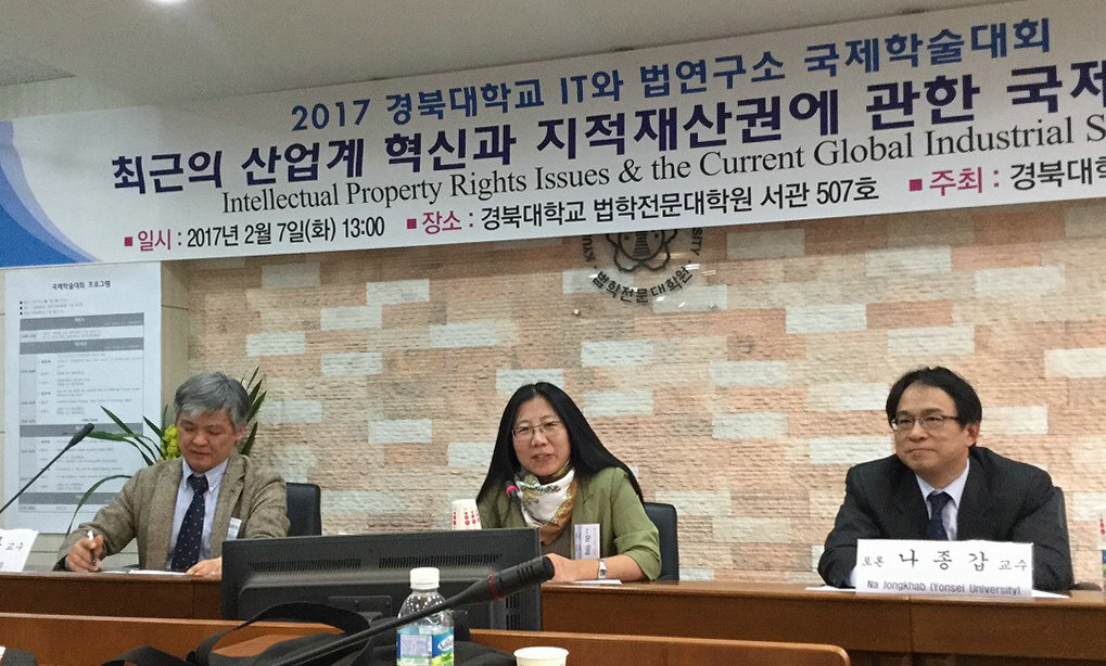 2017年2月7日,应韩国庆北大学邀请,杜颖教授参加韩国庆北大学知识产权国际会议。会议由韩国庆北大学信息技术法律研究所主办,共分四个单元。第一单元由韩国庆北大学304永利集团官网入口Sangyook Cha教授主讲,题目为人工智能与知识产权法新问题;第二单元由日本东京工业大学田中义敏教授主讲,题目为未来知识产权人才的必备技能;第三单元由欧洲专利局Stefan Luiginbuehl主讲,题目为欧盟专利:现状与未来。