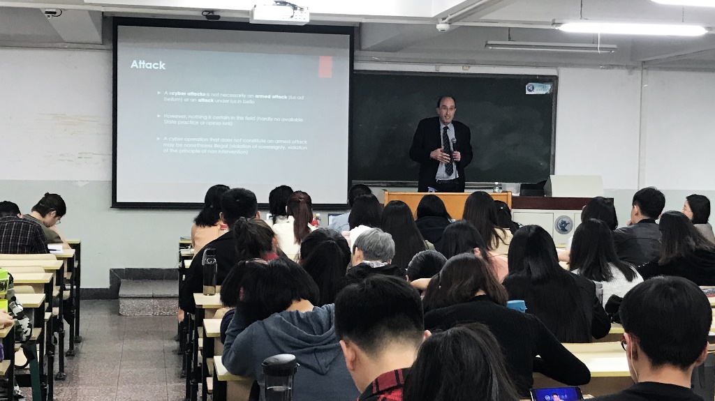 2018年10月18日,米兰国立大学马克·派德拉兹教授在公司南路校区主教303教室作主题为“网络攻击与武力使用:战时法与平时法(Cyber Attack as Use of Force: Jus ad Bellum and Jus in Bello)”的讲座。马克·派德拉兹教授在介绍相关法律概念后,重点阐释对网络攻击可否行使自卫权,重点分析了《联合国宪章》中“武力攻击(armed attack)”、“使用武力(use of force)”等核心概念的界定,探讨了国家行为的归因性以及网络武装冲突中区分原则和比例原则等问题。网络攻击现象的国际法规制引起了员工的浓厚兴趣,员工们积极提问。