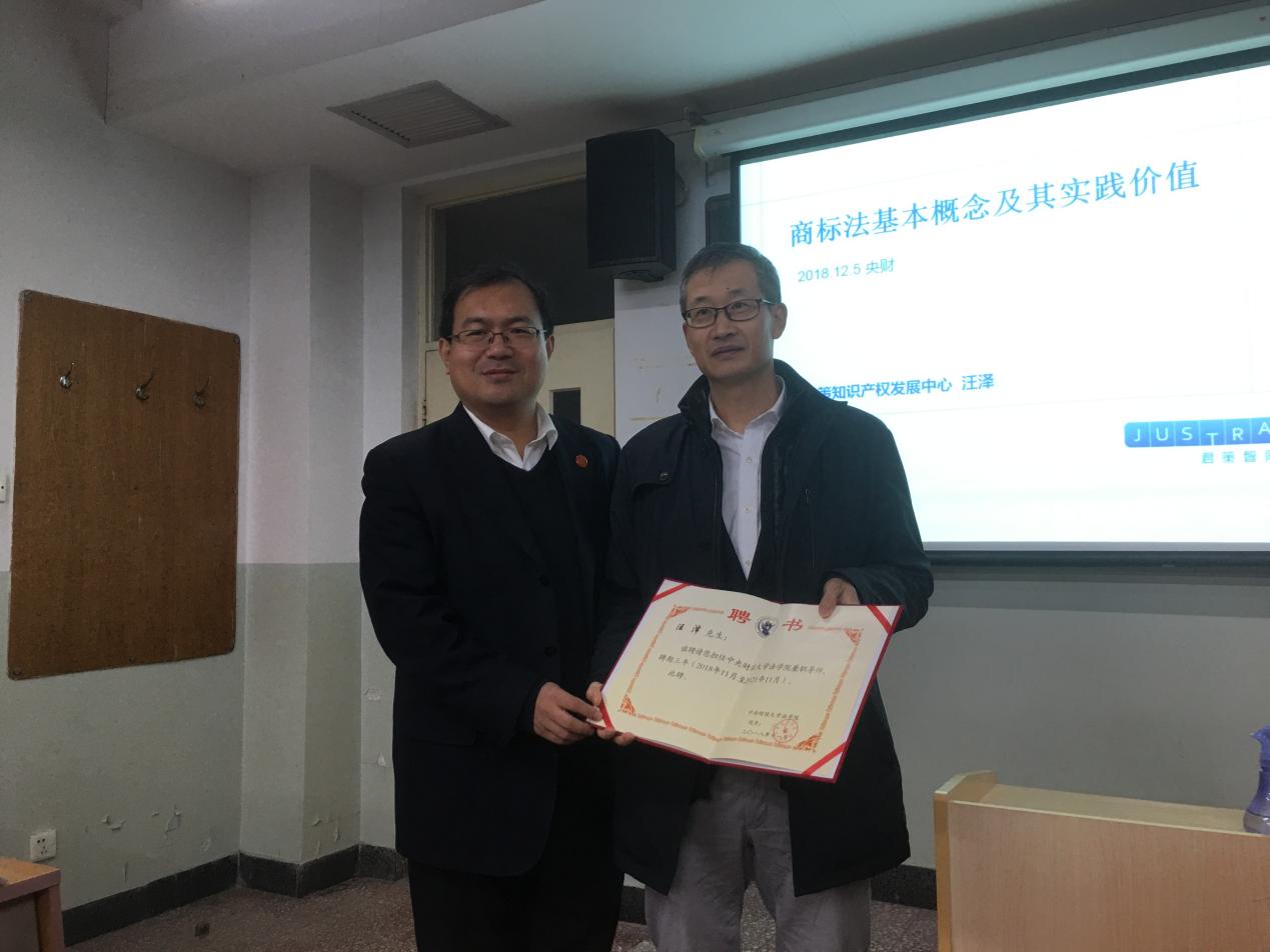 2018年12月5日,北京君策知识产权发展中心主任、国家知识产权专家库专家汪泽做客公司,于公司南路校区主教楼301教室进行“商标法基本概念及其实践价值”的主题讲学。公司经理尹飞教授出席,304永利集团官网入口2017级、2018级硕士参与本次讲学。本次讲学由304永利集团知识产权研究中心主任杜颖教授主持。