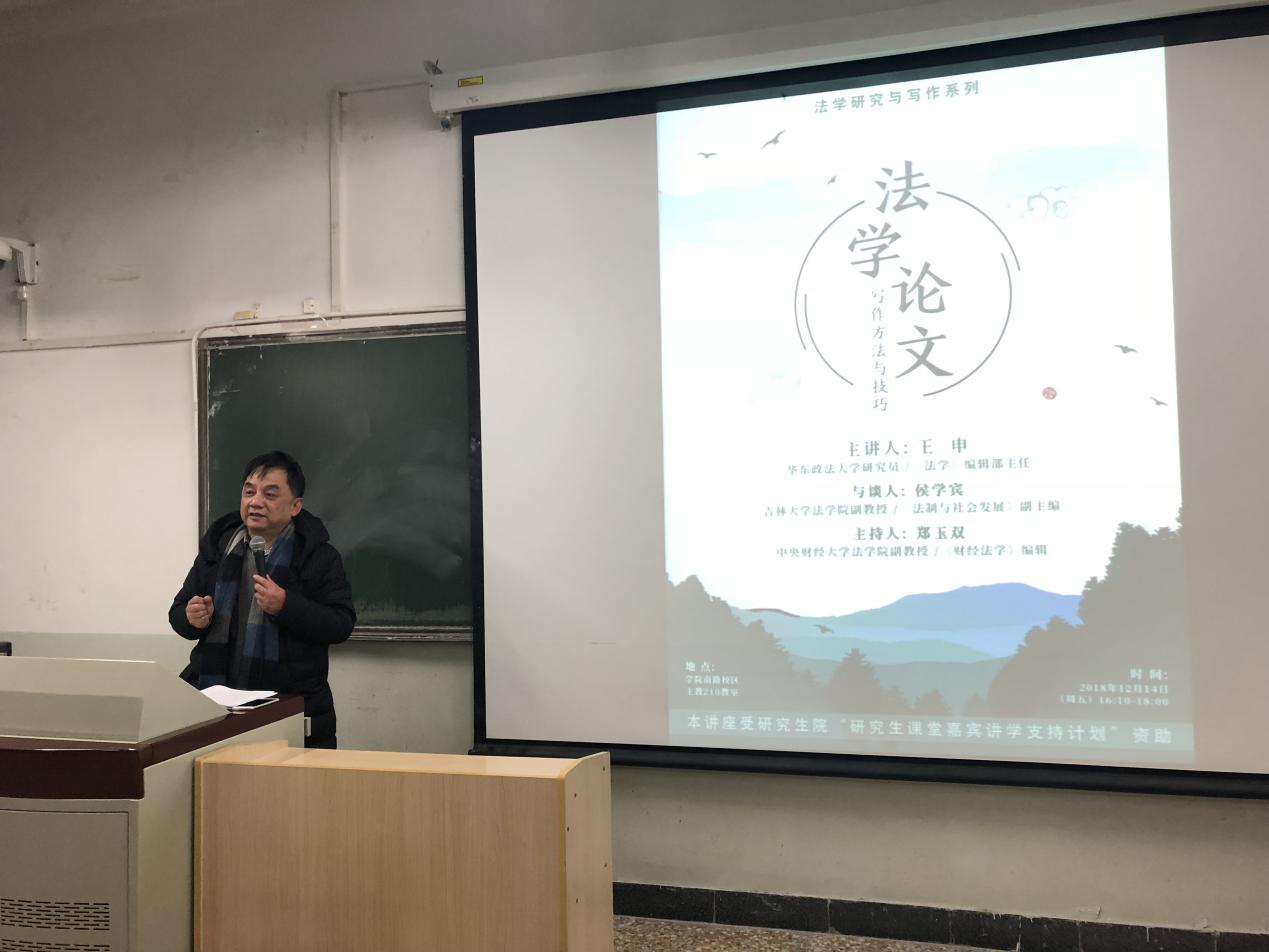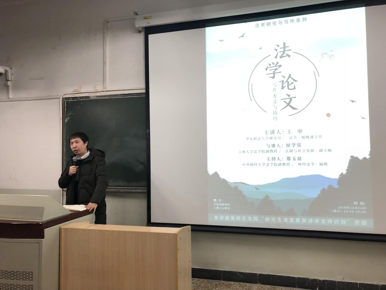 2018年12月14日下午,华东政法大学教授、《法学》编辑部主任王申到访公司,在主教210教室为公司师生主讲“法学论文写作方法与技巧”。吉林大学304永利集团官网入口副教授、《法制与社会发展》副主编侯学宾担任本次学术讲座的与谈嘉宾,公司理论法学教研室主任、《财经法学》编辑郑玉双副教授担任主持人,张小平副教授和刘权副教授参加讲座。