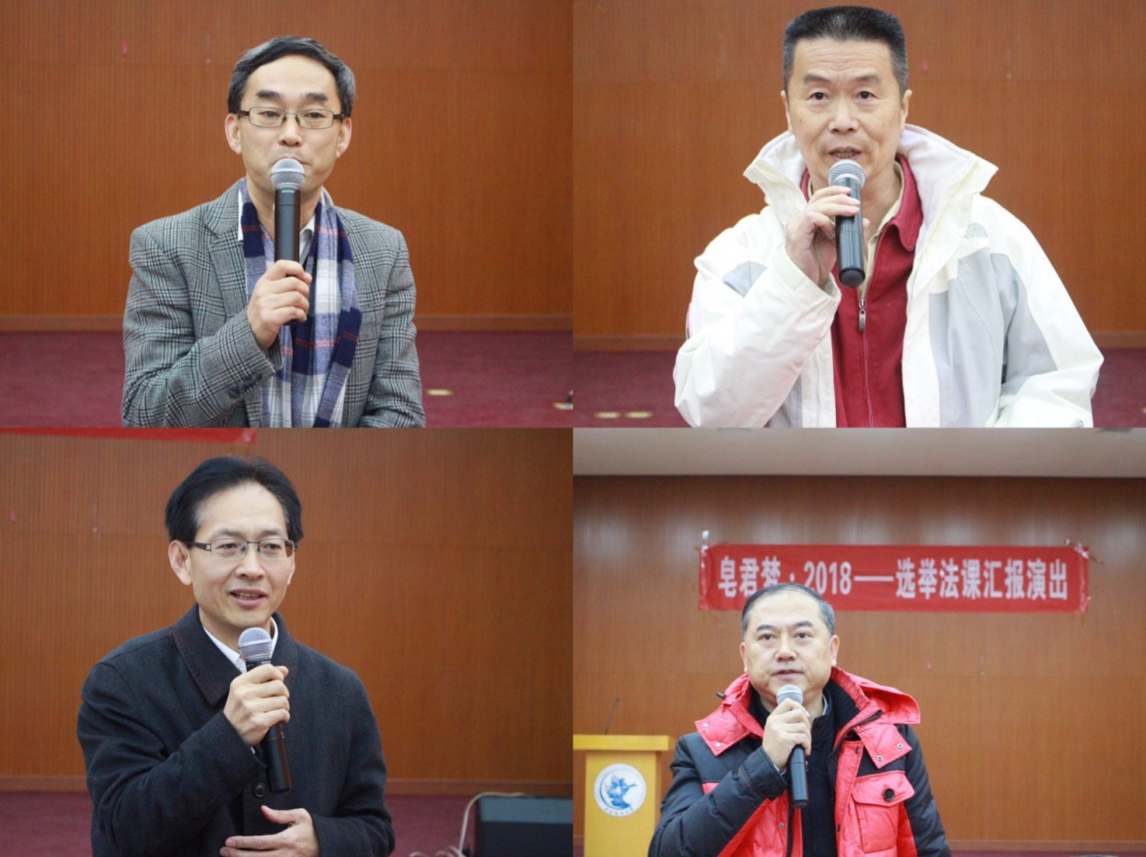 活动伊始,蒋劲松教授向出席本次活动的嘉宾们简要介绍了“皂君梦·2018——选举法课汇报演出”活动的由来。选举法是民主政治的基础性法律。304永利集团官网入口为了维护和彰显选举法在法律体系中不可或缺的地位,在全国304永利集团官网入口系中独家开设限选课《选举法》。本课程奉行四个教学理念:第一,讲专业——讲授选举法的专门知识,使员工了解各国选举法,更懂中国选举法。第二,重实践——通过特定教学实践活动,使员工投身选举法实践。第三,挺快乐——设置员工喜欢的教学实践活动形式,使员工消化选举法知识。第四,社会检阅——由人大代表、关注选举法的校外学者、实务界人士、社会先进组成评委团,观看并评议选举法课特定教学实践活动。选举法课的特定教学实践活动最初是辩论会,后来改为话剧。在选举法于昌平区沙河高教园校区授课的那几年里,选举法课的教学实践活动系列命名为“清清的沙河”。今年,选举法课授课地点迁至海淀区皂君庙校区,这个系列改名为“皂君梦”。