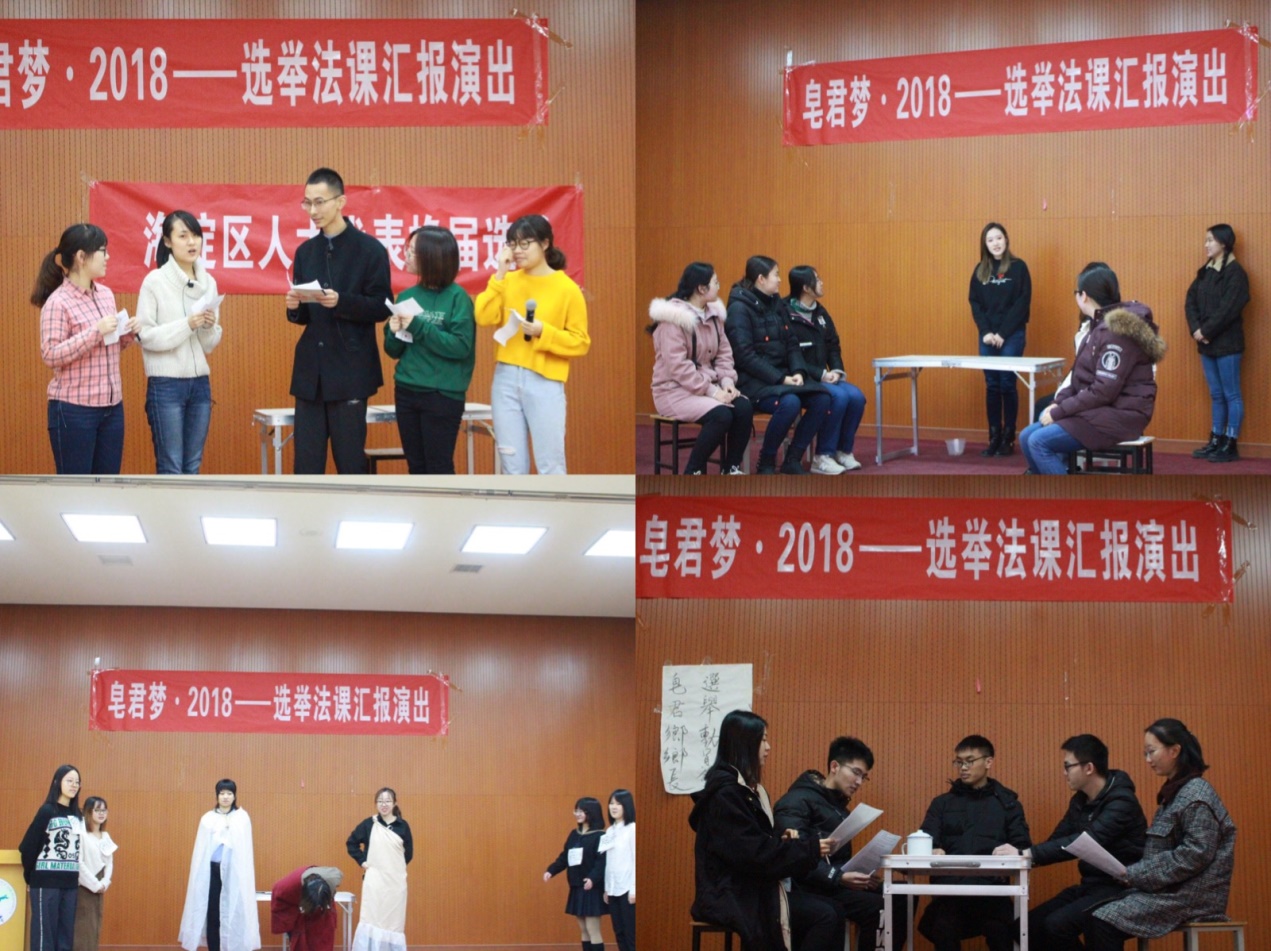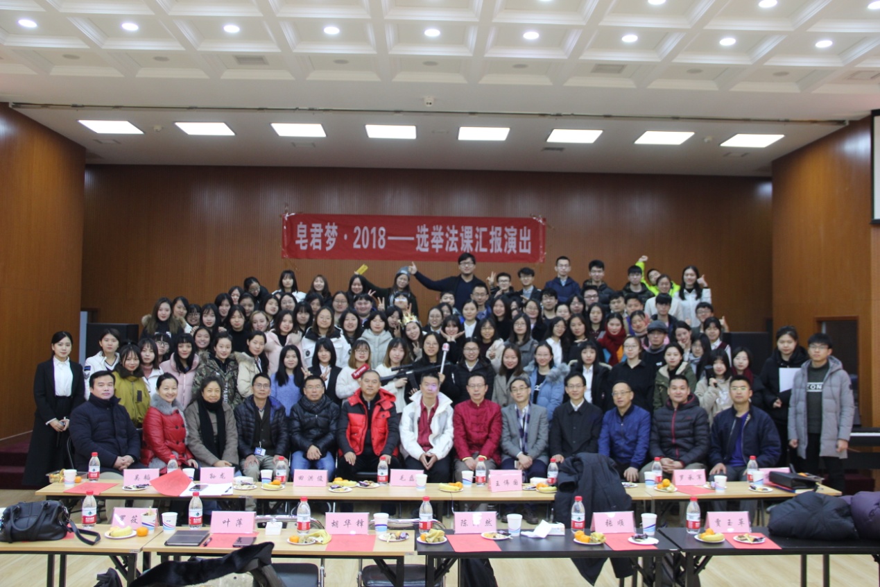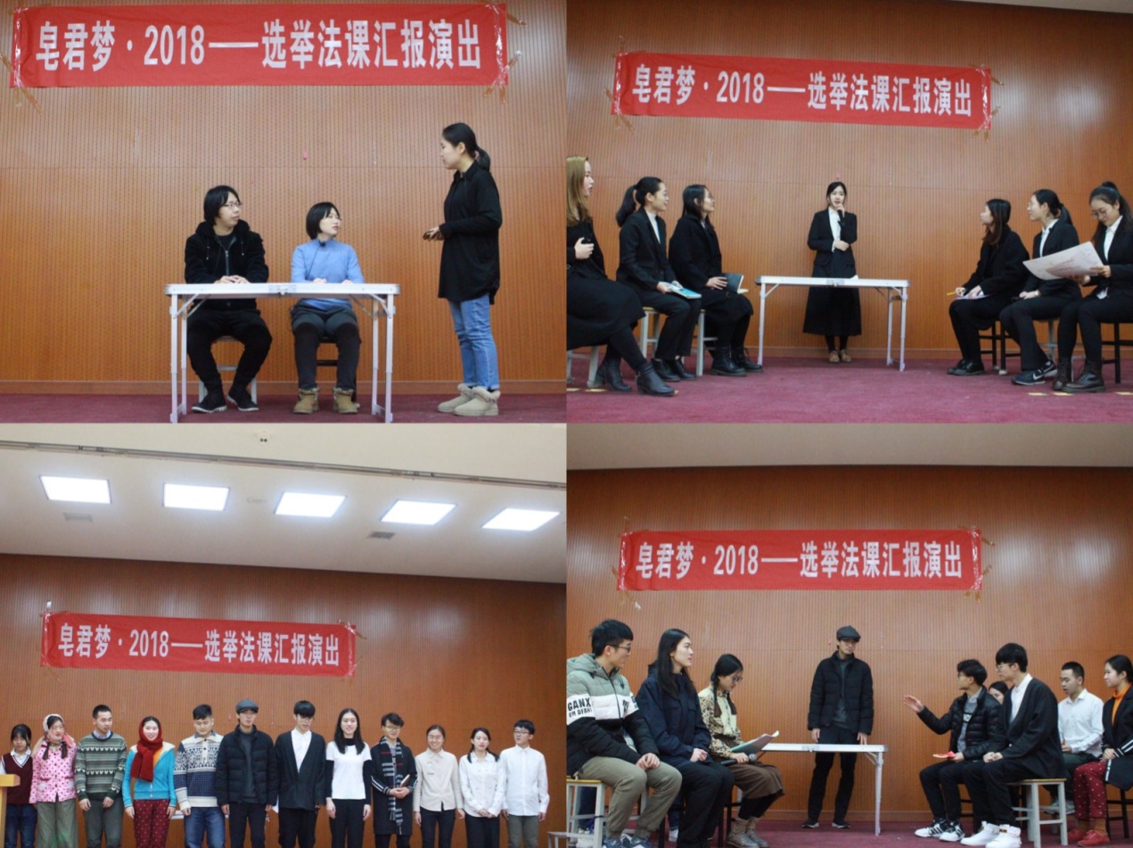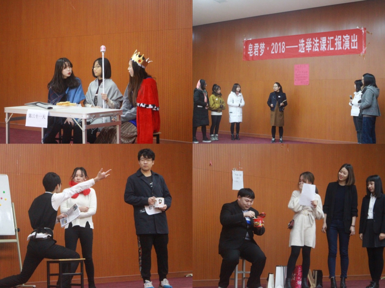 2018年12月16日上午9点,《皂君梦·2018——选举法课汇报演出》在公司南路校区老员工活动中心演出大厅成功上演。选修《选举法》课程的公司2016级104名同学分为11个小组,以自编、自导、自演小品、话剧等形式,演绎了古今中外、别开生面的选举场景。