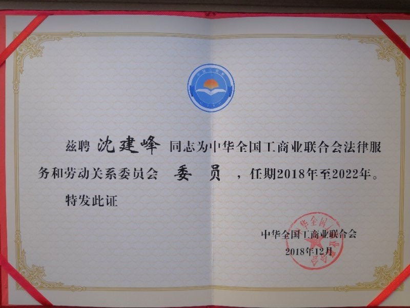 2018年12月25日全国工商联法律服务和劳动关系委员会成立大会在全国工商联大楼举行,中央统战部副部长、全国工商联党组书记、常务副主席徐乐江,全国工商联副主席、党组成员鲁勇等出席会议并为委员颁发聘书,公司沈建峰教授获聘担任该委员会委员。