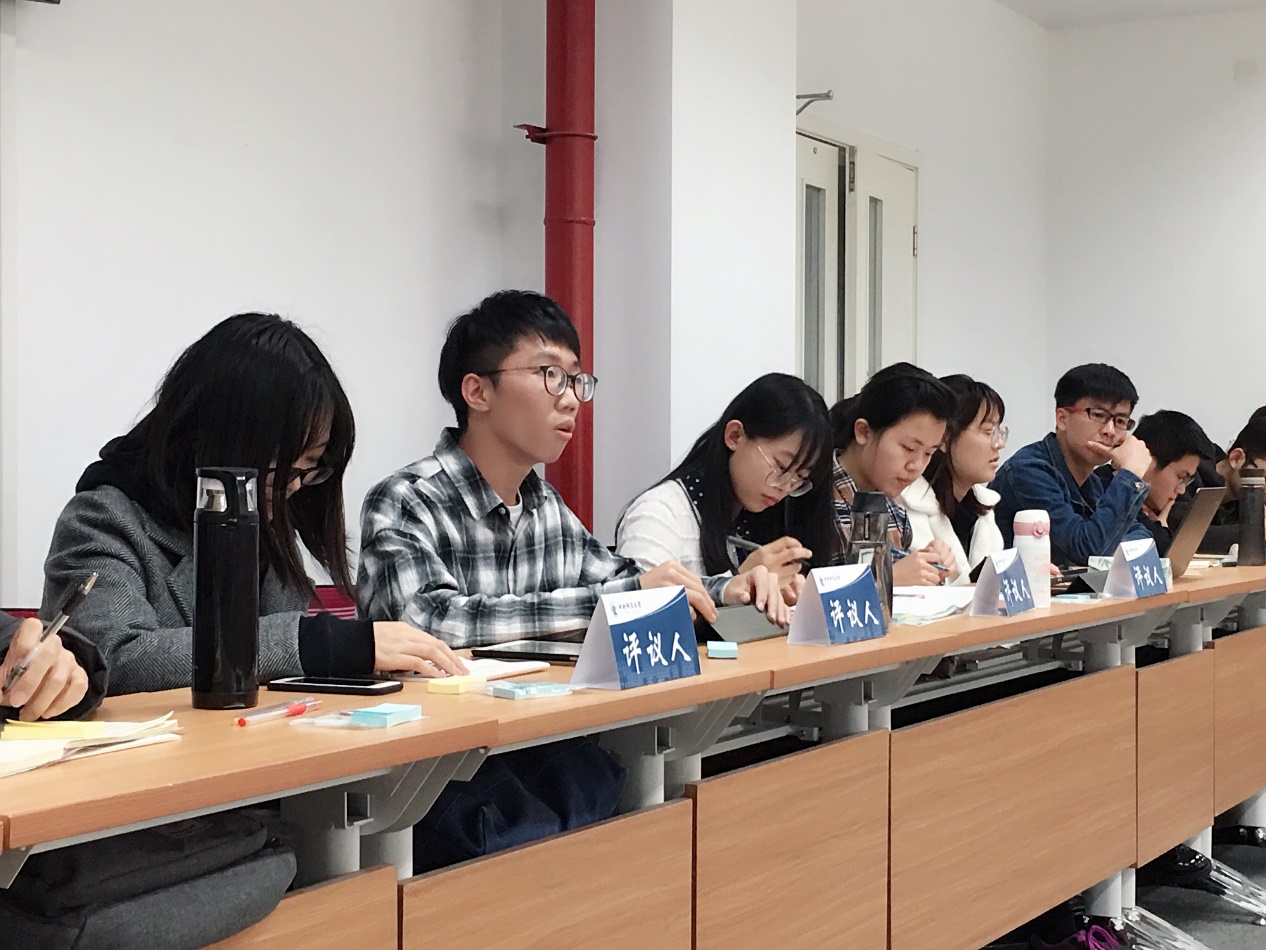 在指导老师及嘉宾发言总结环节,胡晓珂副教授、殷秋实博士、周游博士分别对发言人的发言做出了评价。胡晓珂副教授对大家积极参加工作坊表示了热烈欢迎,同时建议同学们应不断提升读书的数量,学会有选择性地读书。殷秋实博士肯定了四位发言人的展示,并建议大家在读书时要有自己的思考,学会把作者的观点用自己的语言表达出来。周游博士认为:张磊同学表达通畅,但其观点提出得较晚;亚云浩同学准备充分,表达风趣清晰,但所讨论的问题欠缺一定的深度;许智琛同学思维活跃,建议在发言时注意语速;董玥同学表达清晰、逻辑顺畅,但其发言仅有广度却缺乏深度。最后,胡晓珂副教授谈到法学研究非常重视思维的逻辑性,同学们应当珍惜发言的机会,注重日常训练。
