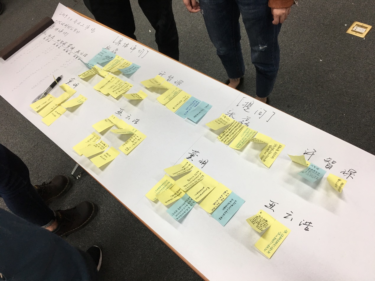 在全体成员互动环节,为破解由于时间限制而大部分人无法提问的硬伤,本工作坊采取贴便签的方式,积极地向发言人进行提问,并针对各发言人的展示做出了具体评价。最后,由指导老师现场选取其中有意思或有价值的问题向发言人提问,并由发言人作答。