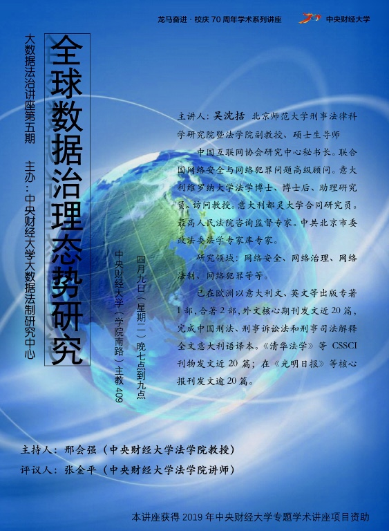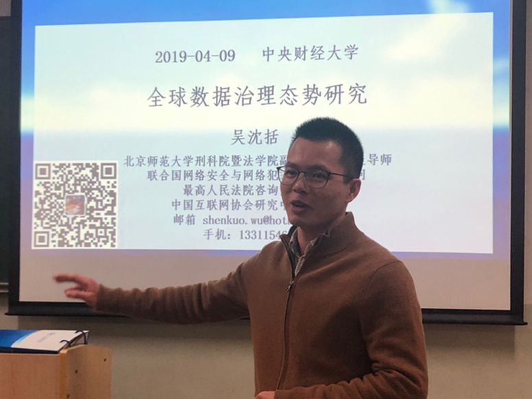 2019年4月9日晚,北京师范大学刑事法律科学研究院暨304永利集团官网入口副教授、硕士生导师吴沈括做客304永利集团官网入口第5期大数据法制讲座,作主题为”全球数据治理态势研究“的专题讲座。