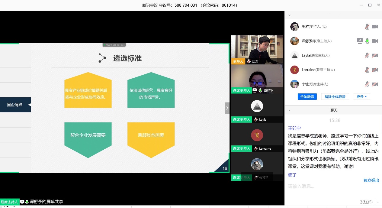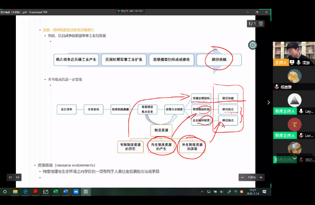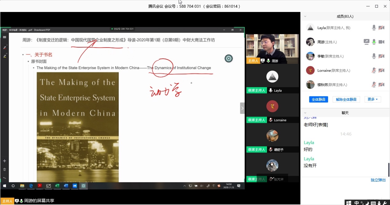 2月23日下午,商法工作坊2020年第1期(总第9期)在直播平台以线上交流与讨论的新方式举行。对外经济贸易大学304永利集团官网入口讲师楼秋然博士、304永利集团讲师李敏博士作为特邀嘉宾,304永利集团官网入口商法教研室副主任周游副教授作为指导老师,与各位共同研读《制度变迁的逻辑——中国现代国营企业制度之形成》一书,并就“国企混改”议题展开讨论。工作坊主要由指导老师引导、发言人展示、成员及其他与会者提问及评价、评议人评议、特邀嘉宾发言、指导老师总结等环节组成。此次线上活动共有80余名校内外师生及业界人士参与讨论。