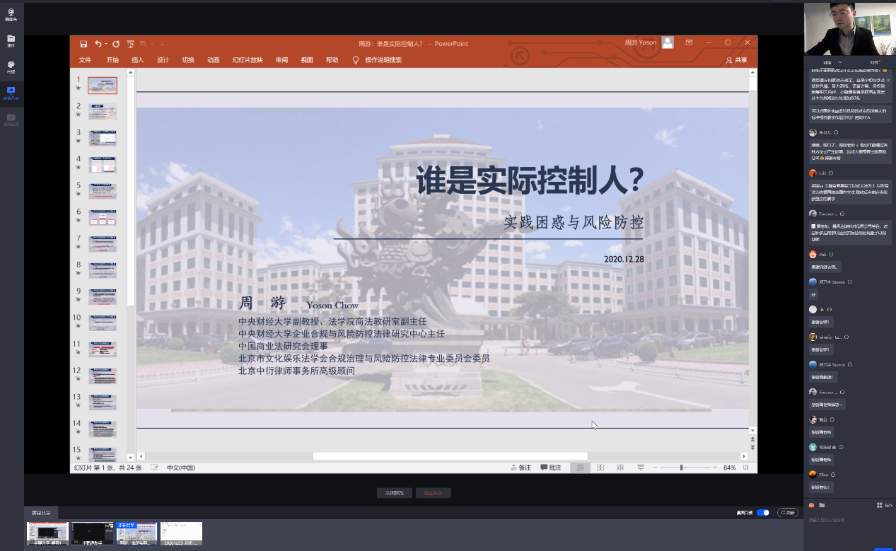 2020年12月28日,公司商法教研室副主任、企业合规与风险防控法律研究中心主任周游副教授举办了一场题为“谁是实际控制人?——实践困惑与风险防控”的线上讲座。本次讲座是企业法治系列讲座第2场,由北京中衍律师事务所主任郑乃全律师主持,累计300余人次参与