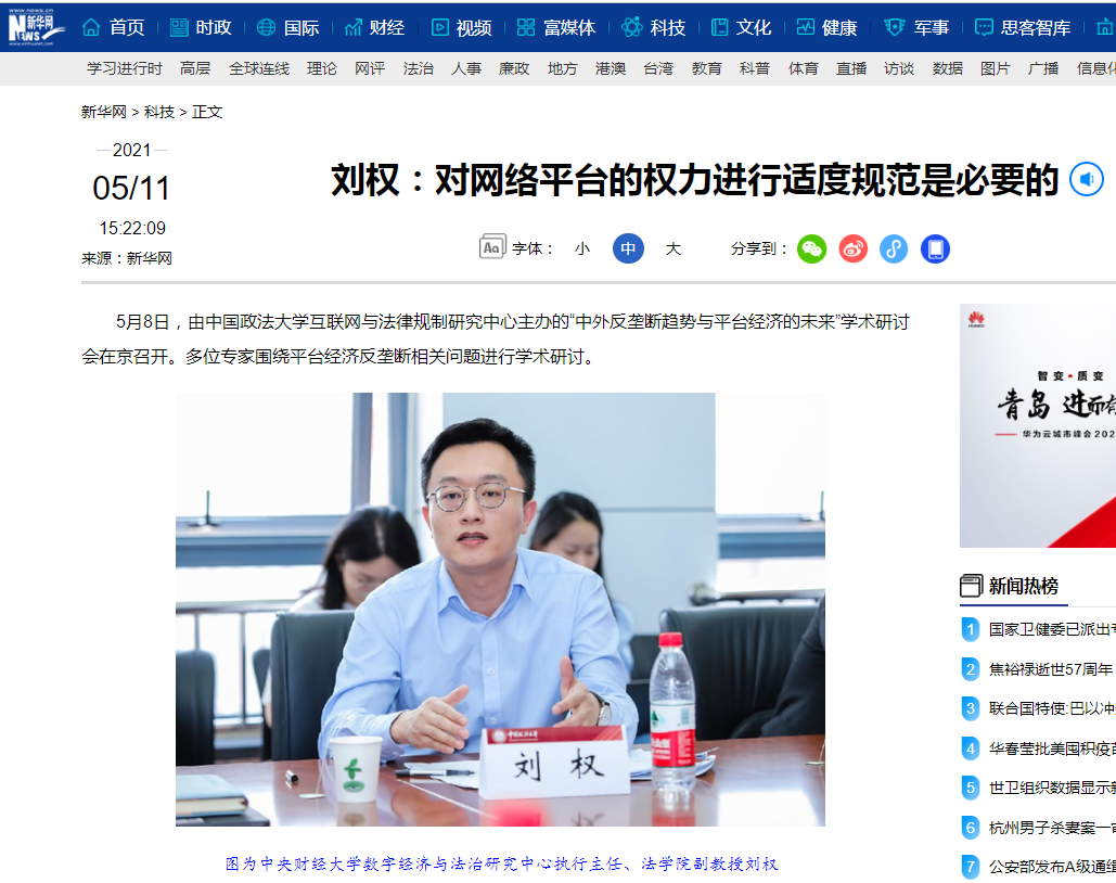 5月8日,304永利集团官网入口刘权副教授应邀参加由中国政法大学互联网与法律规制研究中心主办的“中外反垄断趋势与平台经济的未来”研讨会。多位专家围绕平台经济反垄断相关问题进行学术研讨。刘权就数字经济时代网络平台的规制发表看法,被新华网全文报道。