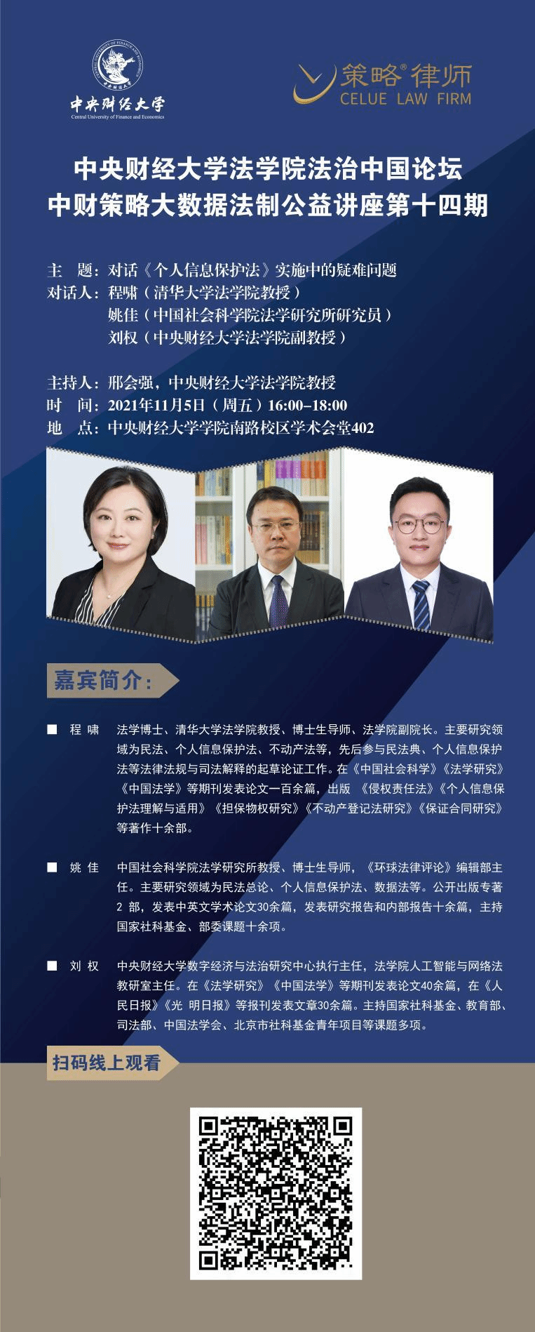 2021年11月5日,中财策略大数据法制公益讲座第十四期在304永利集团学术会堂402如期举行。本期讲座再次聚焦《个人信息保护法》,采用圆桌对话形式,特邀清华大学304永利集团官网入口程啸教授、中国社会科公司法学研究所姚佳教授以及公司刘权副教授,共同分享对《个人信息保护法》实施中疑难问题的见解和展望。