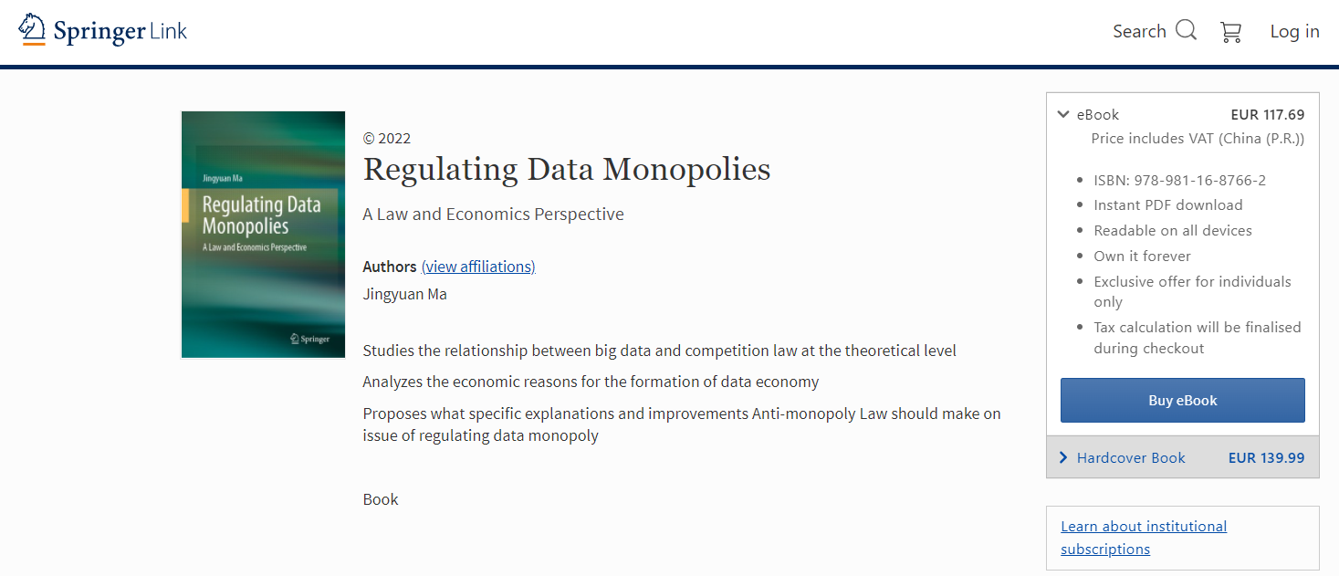公司教师马静远副教授的英文专著Regulating Data Monopolies – A Law and Economics Perspective(《数据垄断的法律规制:法经济学视角》)2022年1月由德国施普林格出版社Springer Nature出版。