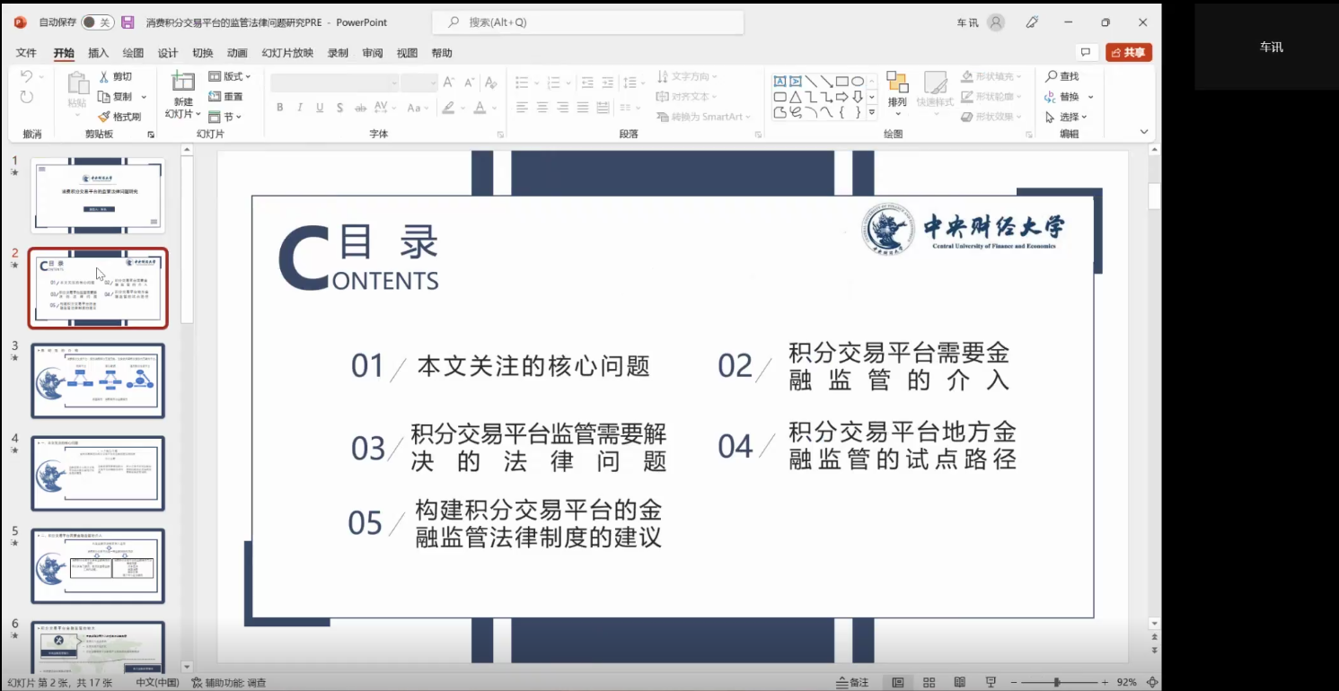 随后是发言人的分享环节。公司2020级法律(法学)硕士研究生车讯,分享了主题为“消费积分交易平台的监管法律问题研究”的硕士毕业论文。文章按照“提出问题,分析问题和解决问题”的逻辑结构分为五个板块,即问题的提出,积分交易平台金融监管介入的必要性和可行性,积分交易平台监管要解决的法律问题分析,积分交易平台地方金融监管的试点路径以及构建积分交易平台的金融监管法律制度建议,发言人将按照行文逻辑的顺序展开分享。