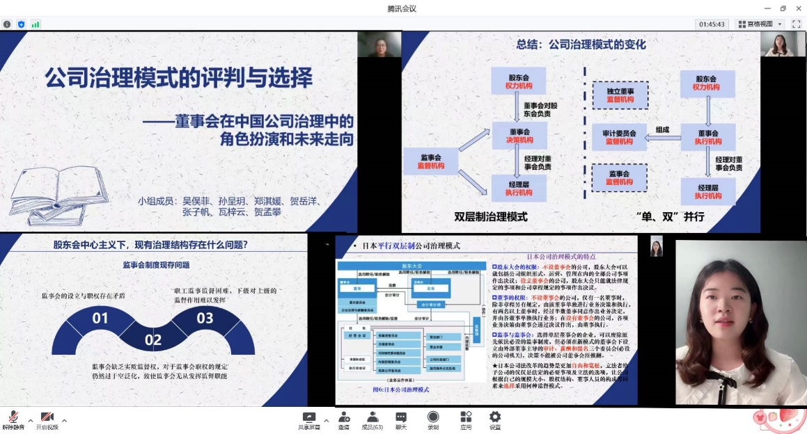 随后进入发言组展示环节,公司2021级硕士研究生孙呈玥、2020级本科生张子帆、2019级本科生郑淇媛、2021级硕士研究生吴俣菲代表发言组分享以“公司治理模式的评判和选择——董事会在中国公司治理模式中的角色扮演和未来走向”为主题的相关研究。第一部分,孙呈玥同学通过类案整理和个案分析的方式向大家展示了现阶段我国公司治理模式中董事会存在定位不明,职能混乱等现象,并就此引出我国公司治理模式中董事会应该扮演何种角色等问题。第二部分,张子帆同学以美国、德国和日本三个国家为例介绍了域外国家公司治理的基本模式和主要特点。首先张子帆同学对本期研读书目做简要梳理,后分别介绍美国、德国和日本公司治理模式的特点,通过进行对比分析总结出,日本公司治理结构分为传统监事制和委员会制,而委员会制与美国的单层董事制在股权结构、股东大会和董事会的职权划分以及监督激励机制上都具有高度的相似性,德国的垂直双层制与日本的传统监事制也有一定的相似之处。第三部分由郑淇媛和吴俣菲两位同学共同分享。郑淇媛同学首先通过《公司法》第22条第2款、第37条、第46条的规定介绍了学界对董事会中心主义和股东会中心主义的划分标准。并从董事会和监事会不同制度分析了其现存的问题。随后吴俣菲同学重点向大家展示了《公司法》修改草案的对比部分,总结出董事会中心主义在修订草案中的六点体现,提出我国公司治理模式已由“双层制治理模式”进入到“单、双”并行的模式。最后,吴俣菲同学指出是否能认为我国公司法修订草案确立了董事会中心主义的问题,并引用了周游老师在《从被动填空到主动选择:公司法功能的嬗变》一文中的核心观点进行回答:我国的公司治理模式之路正在从被动填空走向主动选择。