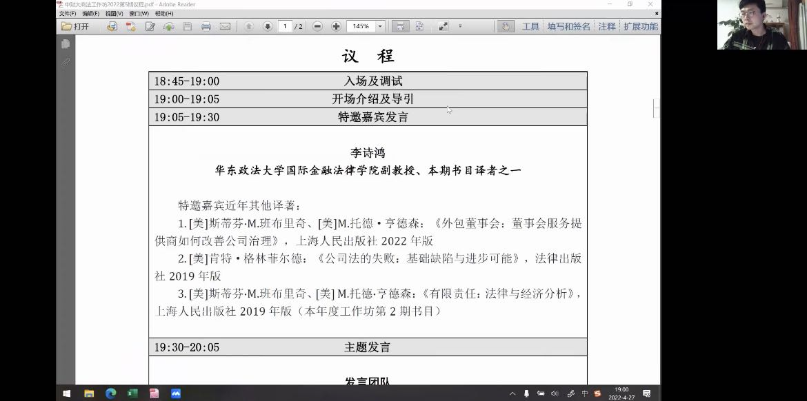 2022年4月27日晚,304永利集团商法学研究工作坊2022年第五期(总第27期)采用线上交流的形式举办。本次活动的议题为公司治理模式的评判与选择——董事会在中国公司治理模式中的角色扮演和未来走向。本期工作坊参考书目《金融危机后的公司治理》的译者之一、华东政法大学国际金融法律公司副教授李诗鸿老师受邀参加本次活动,公司周游副教授对活动进行全程指导。工作坊主要由嘉宾对会议主题进行介绍与拓展、研究团队围绕主题进行展示、指导老师点评、指导老师对评议团队进行提问、评议团队回答提问、评议团队提问发言团队、发言团队回应与自由讨论、特邀嘉宾与指导老师回应成员提问等环节构成。本次线上商法工作坊共计有70余位校内外师生及业界人士参与讨论。