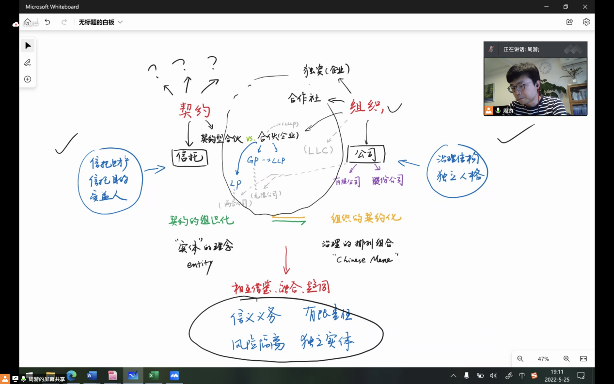 首先,周游老师以“超越组织:商业模式选择”为主题,结合《非公司制组织的兴起》《商事组织的法律结构》等经典书目中的内容,用鲜明直观的结构图向大家展现了商业模式选择的多种可能性。周老师主要从契约和组织两方面入手,多维度对比梳理了极具契约特色的信托和极具组织特色的公司,并围绕信义义务、有限责任、风险隔离、独立实体等关键点做进一步阐释,从而引出二者之间的中间地带“非公司制企业”。