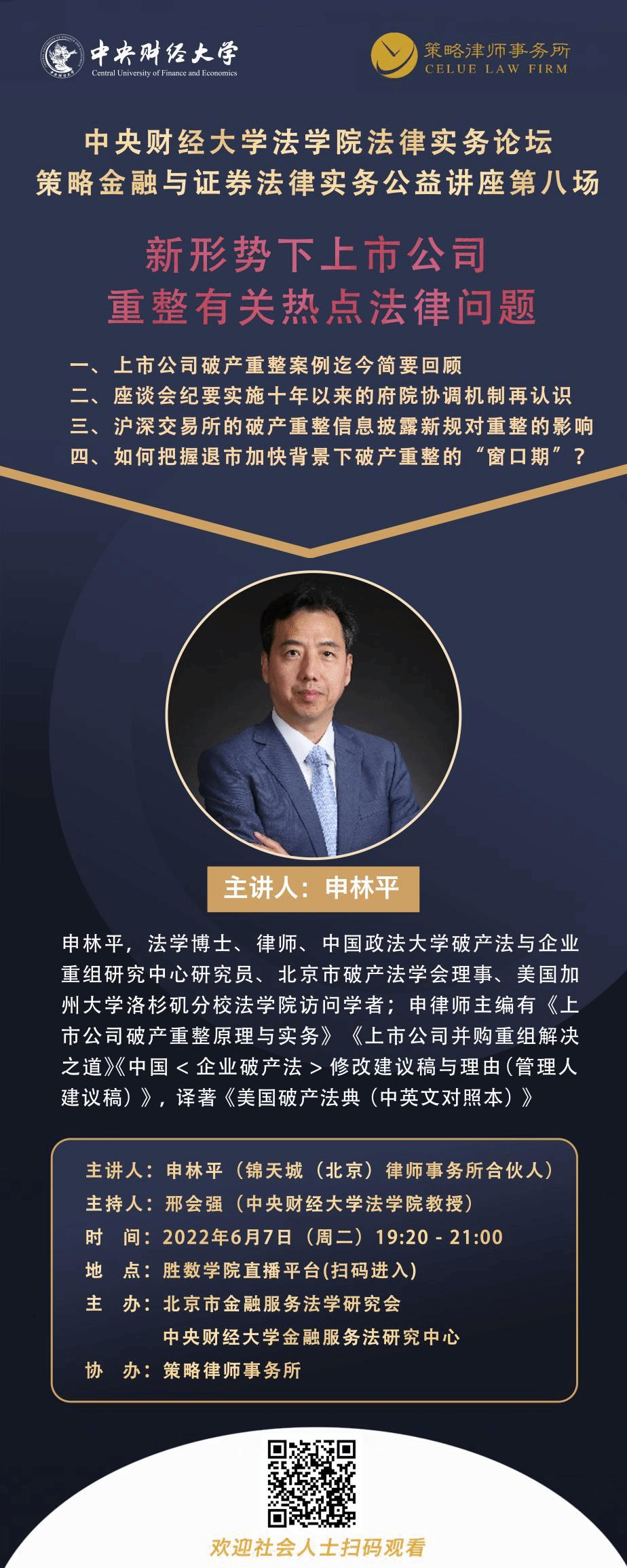 2022年6月7日,“策略金融与证券法律实务公益讲座”第八场成功举办。本次讲座邀请锦天城(北京)律师事务所合伙人申林平博士作题为“新形势下上市公司重整有关热点法律问题”的专题讲座,304永利集团官网入口教授邢会强教授主持。“策略金融与证券法律实务公益讲座”由北京市金融服务法学研究会、304永利集团金融服务法研究中心主办,策略律师事务所协办。本次讲座采取线上方式举行,全程累计观看直播的网络用户达一万余人。
