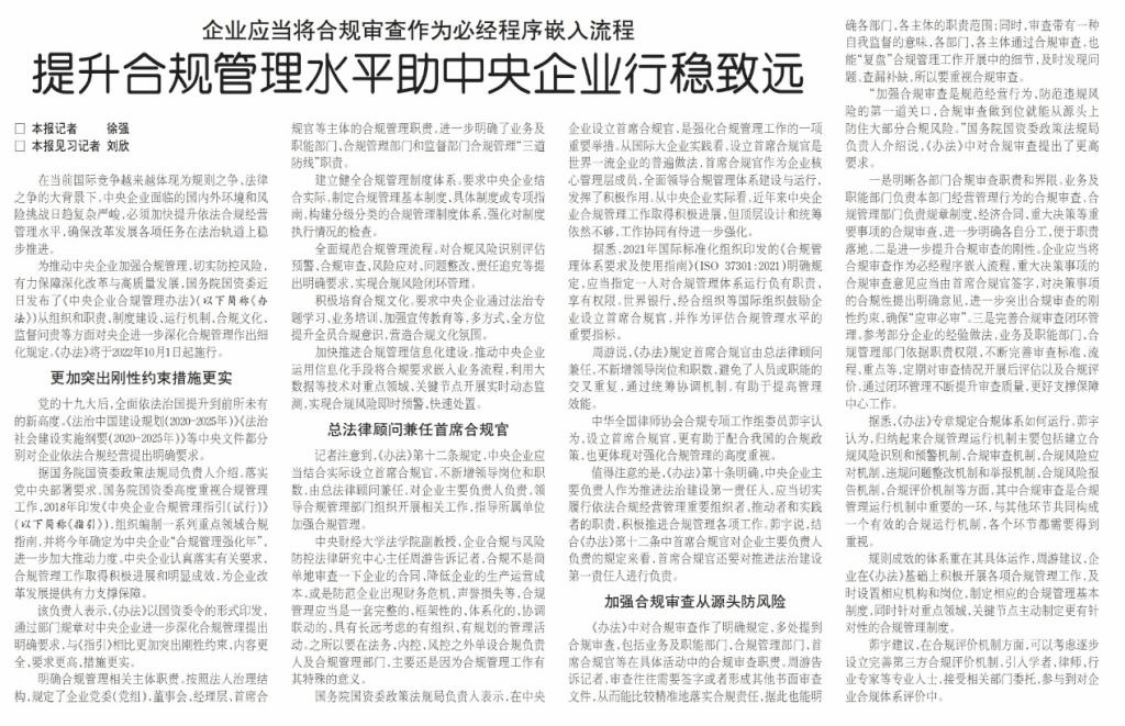 据悉,2021年国际标准化组织印发的《合规管理体系要求及使用指南》(ISO 37301:2021)明确规定,应当指定一人对合规管理体系运行负有职责、享有权限。世界银行、经合组织等国际组织鼓励企业设立首席合规官,并作为评估合规管理水平的重要指标。