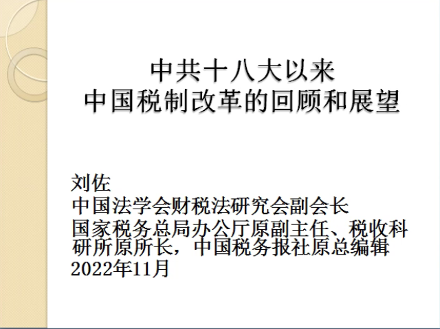 第二部分是关于进入中国特色社会主义新时代以来的税制改革概况。刘佐老师强调,这一时期我国财税体制改革得到进一步深化,在落实税收法定原则、完善税收法律法规、深化税制改革、减税降费等方面取得一系列重大成就,税收制度改革也取得了重大进展。