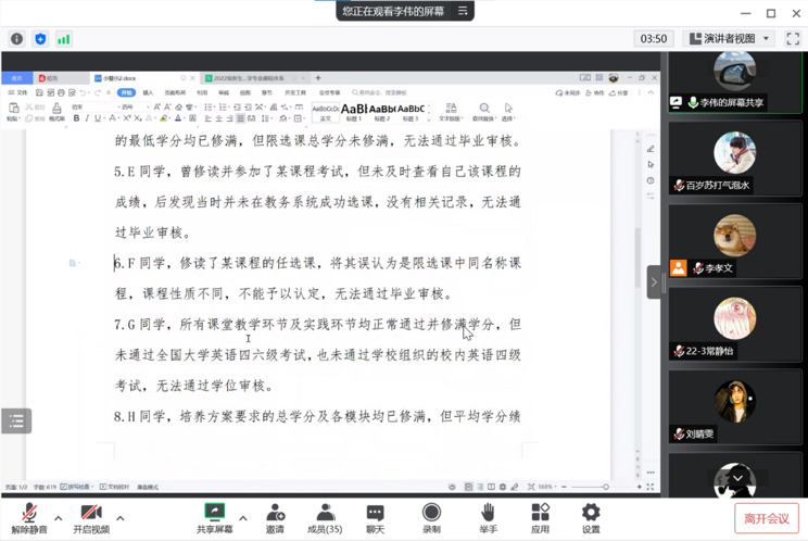 最后,针对培养方案执行过程中曾出现的问题,李伟副经理整理了许多相关典型的事例,向同学们进行了针对性地举例说明。较为典型的情况有:英语课学分修够,但类别不正确;没有进行线上举行的“劳动与安全教育课”的考试,导致无法通过毕业审核;总学分和各模块已修满,但平均学分绩点未达到1.5(65分)等。随后,李伟副经理提醒同学们一定要仔细阅读并理解培养方案的内容,不能忽视其重要性,避免出现以上问题影响毕业和学位审核。