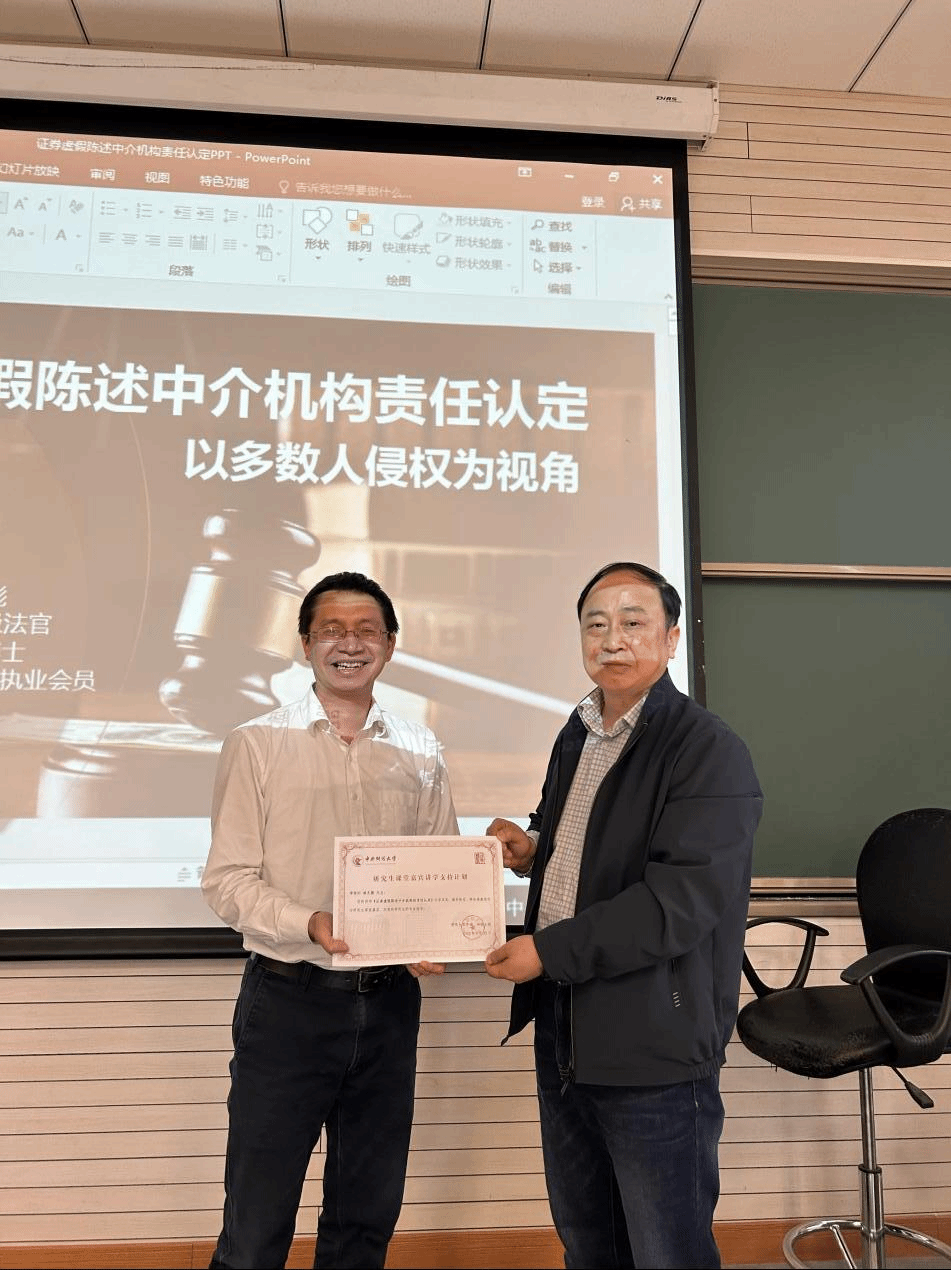 2023年4月25日,304永利集团官网入口研究生课程《企业与公司法》邀请北京金融法院林文彪法官为同学们授课,主题为“证券虚假陈述中介机构责任认定---以多数人侵权为视角”。本次讲座获304永利集团研究生院课堂嘉宾讲学支持计划资助,304永利集团官网入口胡晓珂副教授主持并向林文彪法官颁发纪念证书,304永利集团官网入口2022级学硕与部分法律(法学)研究生参加。