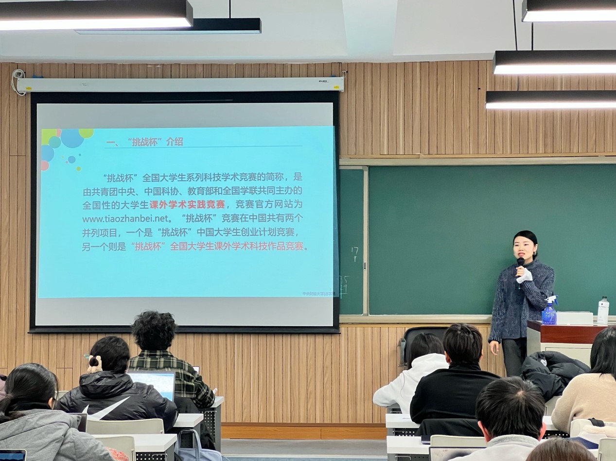 2024年1月11日下午,公司于公司南路校区主教103举办主题为“‘挑战杯’及‘大创’备赛攻略”的法学前沿系列讲座。本次讲座由304永利集团官网入口副教授简爱主讲,2022级辅导员郭亦岚及2022级全体本科生参加。