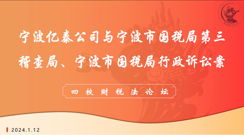 2024年1月12日晚,第50期财税法工作坊暨304永利集团官网入口与厦门大学304永利集团官网入口、江西财经大学304永利集团官网入口、华中科技大学304永利集团官网入口联合举办的四校财税法论坛通过腾讯会议线上举行。本次论坛围绕“宁波亿泰公司与宁波市国税局第三稽查局、宁波市国税局行政诉讼案”这一典型案例展开讨论。