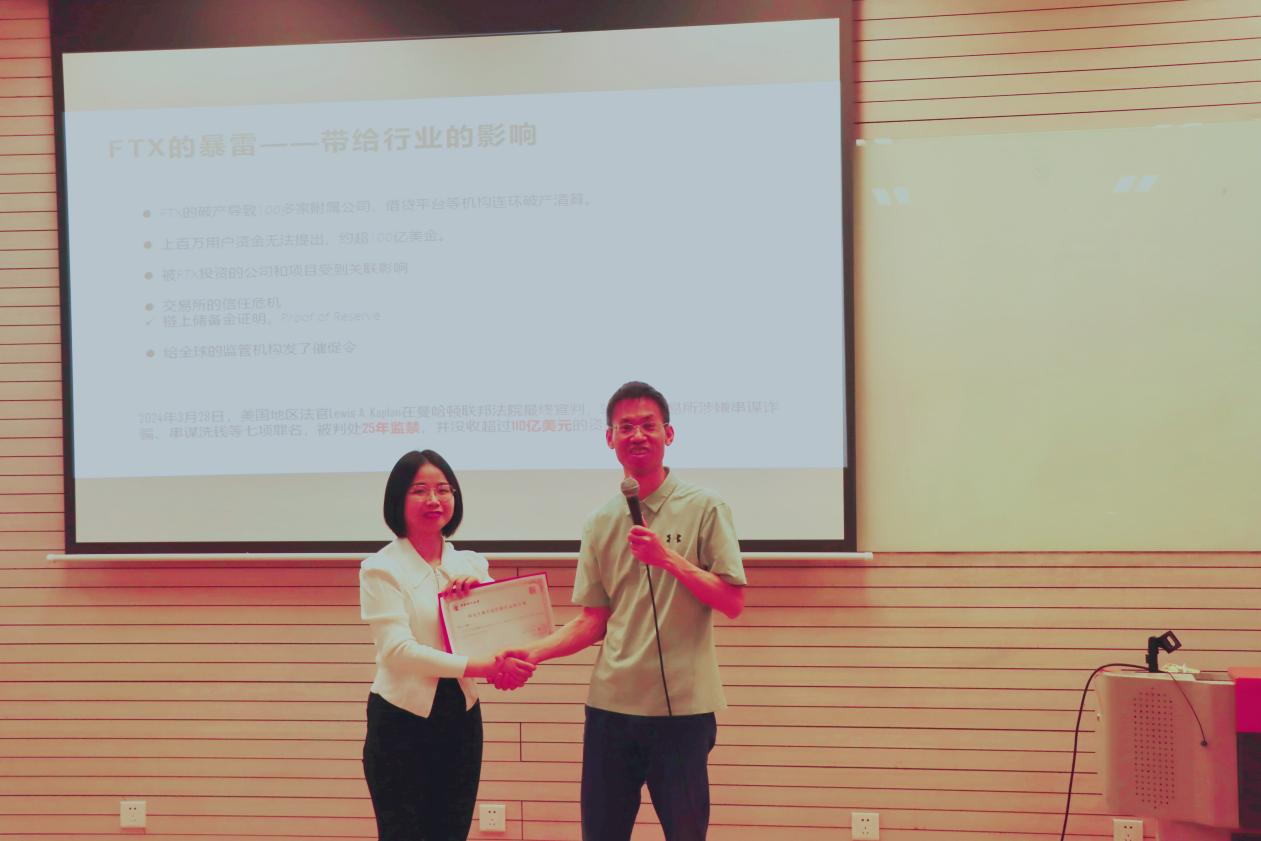 邓建鹏教授向李慧研究员颁发讲座纪念证书,并作讲座总结。他表示,区块链作为一种底层技术,具有广泛的应用领域与广阔的应用前景,同时也带来了诸多法律问题。本场讲座以区块链的技术与应用为切入点,深入探讨了区块链技术的底层逻辑与应用方向。作为法学研究者,对于区块链技术的理论研究往往受制于技术专业壁垒,只有不断深化学习、关注并研究区块链行业的最新发展动态,才能为区块链法治研究找到有效的切入口。本次讲座是“区块链法治论坛”在今年举办的第二场活动,为同学们提供了区块链产业最前沿的资讯与案例,也为区块链领域的法治研究提供了新的思路和切入点,值得高度关注。
