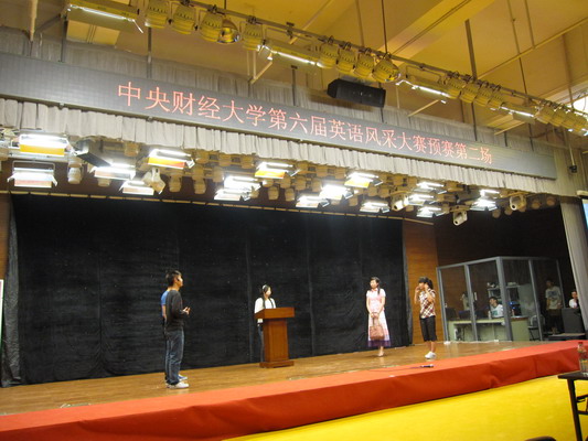 5月19日下午,公司第六届英语风采大赛预赛第二场在老员工活动中心金色大厅举行。08法学1班的杨之乔、岑雨杨,09法学1班的武静等五位同学代表公司与保险、外国语等其他9个公司展开了激烈的角逐。