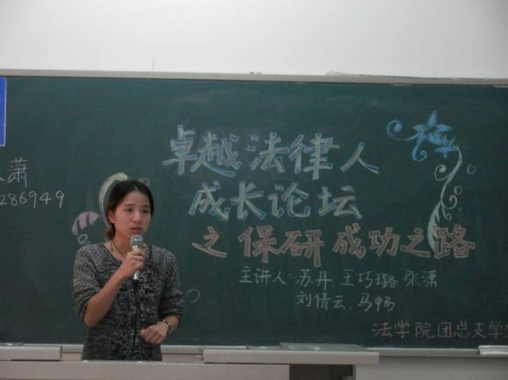 10月17日下午3点20分,公司在沙河主教305教室举行了“卓越法律人才成长论坛之保研成功路”经验交流会。公司党总支书记李岩老师,经理助理李伟老师、团总支书记李杰老师出席了本次交流会,主讲人分别是来自2010级的苏丹同学、王巧璐同学、张潇同学、刘倩云同学以及马畅同学,各年级的同学们也踊跃参与,教室内座无虚席。