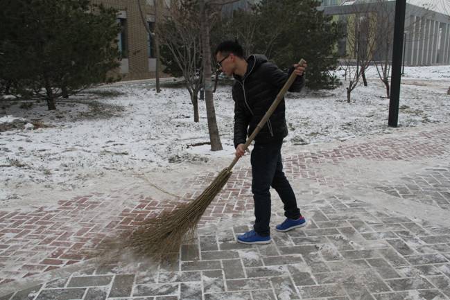 下午三点左右,师生六人带着公司分发的雪铲、铁锨、扫帚等工具在7号教学楼楼下开始了清雪工作。由于距离开始下雪已经过去了将近两天,积雪变得厚实、坚硬,给清雪工作造成了很大的困难。雪天地滑,为了保持平衡不至摔倒,铲雪过程中每个人都得小心翼翼;为了除雪、扫雪时使上力气,寒冷的天气小伙子们坚持不戴手套,拿着冰冷的雪铲工作了整整一个小时。经过李杰老师和同学们的共同奋战,7号楼楼下道路的积雪基本清扫完毕,师生的过往出行又多了一分安全。