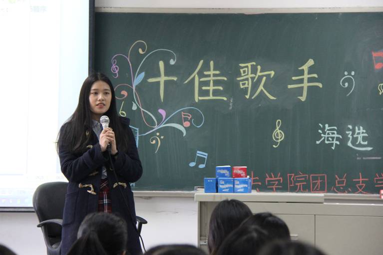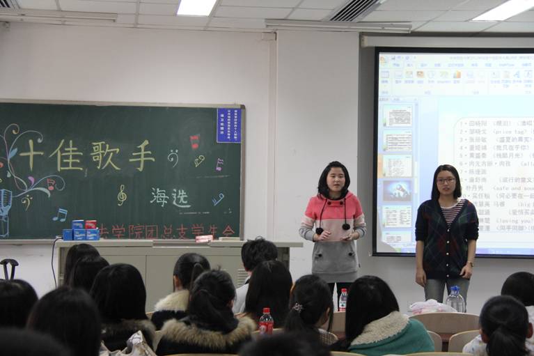 接着,歌唱选手开始比赛,此次比赛共有14位选手参加。第一位演唱的是2011级的田晓阳,一首清唱的《眼泪》打动了评委,也感动了在座的大众评委们;接下来2012级皱晓戈的《Price tag》、2012级张丽敏的《后来》、2011级董娅娟《我只在乎你》,同样是用优美的歌声感染着在场的每一位观众和评委;一首《残酷月光》,2012级黄盛秦带领大家进入了一种净美的世界,优美婉转,赢来了观众的阵阵掌声;2012级少数民族同学肉先古丽·肉孜演唱的《allah》让人耳目一新,带领大家领略少数民族音乐的美妙;更让人激动的是2010级的陈逢源演唱的一首民族歌曲《好运来》,可谓是唱功十足,真正体现了民歌的精彩与嘹亮;2012级唐舒雨的《旅行的意义》、2011级吴任桓的《何必要在一起》让大家从民歌的优美中又回到了流行歌曲的旋律里;2012级洪慧英、马睿组合演唱的颇具创新意味的英文歌曲串烧《Baby/ A big big world》、2010级朴丹男清唱的《Safe and sound》,扎实的英文基础、标准的发音和清脆的嗓音给人一种听觉上的享受,掀起了此次比赛的高潮;2012级李韶涵演唱的网络流行歌曲《爱情买卖》带动全场,大家一起high了起来,在紧张的比赛氛围中获得了释放和轻松;2012级李琳楚的《loving you》和《someone like you》可谓是震撼全场,清美的高音,悠扬的美声时刻回响在耳畔,让人回味无穷。最后是由2012级卢星潼演唱的《同手同脚》以及与吴任桓合唱的《因为爱情》,给本次十佳歌手选拔赛划上了一个句号。