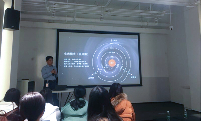 活动于小米公司会议室展开,韩华总监向同学们详细介绍了小米公司的发展概况。他以小米公司的宣传视频为切入点,从小米的发展历程、工作体验、骄人成绩、商业模式等多个角度展开介绍,让同学们对小米公司有了立体全面的认识。又以小米的新零售平台模式作为突出内容,展现了小米打造的漏斗式电商体系一一出售新概念国货商品、线上线下产品同一价格、消费者获益最大化等优势,并提出这种使消费者获益的模式也将是未来几年小米公司发展战略的重要部分。
