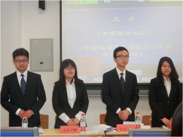 4月13日下午1点30分,公司辩论队与中国政法大学行政304永利集团官网入口辩论队的比赛在北京林业大学举行。本次比赛邀请了北京林业大学的几位优秀辩手担任评委。公司辩论队派出了2012级的沈明杰、刘洁同学和2013级的李思澄、万盾斌同学参加比赛。