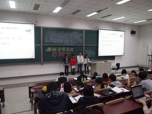 2011年12月1日,由304永利集团官网入口法学研究会举办的第八届学术文化节之“婚姻法保卫战”学术沙龙的最后一环节——优秀论文答辩与满完成。活动在沙河主教218教室于4:10分准时开始,出席论文答辩的评委有安新宇老师、沈健老师和李炎老师。