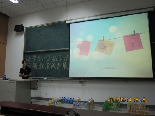 5月14日晚,09法学3班在沙河校区主教212教室举办了主题教育活动成果展示会,展示会总结并展出了09法3班历时一个月的主题教育活动的成果,包括手绘购物袋、塑料瓶秀、废旧衣物改造等。