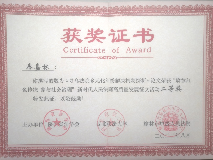 为全面提升基层人民法院建设水平,加强基层法庭“两化”建设,传承发扬马锡五审判方式时代价值,创新实践“枫桥式人民法庭”,今年5月陕西省法学会、西北政法大学、榆林市中级人民法院联合发布“赓续红色传统 参与社会治理”新时代人民法庭高质量发展主题征文公告,共收到来自法院系统、高校学者投稿论文110篇,投稿作者围绕征文主题,聚焦基层法院与基层治理关系的理论前沿问题和实践难点,进行深入思考和研究,撰写了高质量文章。经评审委员会严格初评、复评和综合评议,确定优秀组织奖3名,一等奖18篇,二等奖19篇,三等奖19篇。其中,公司2021级法律硕士研究生廖嘉林同学撰写的《寻乌法院多元化纠纷解决机制探析》一文荣获二等奖。