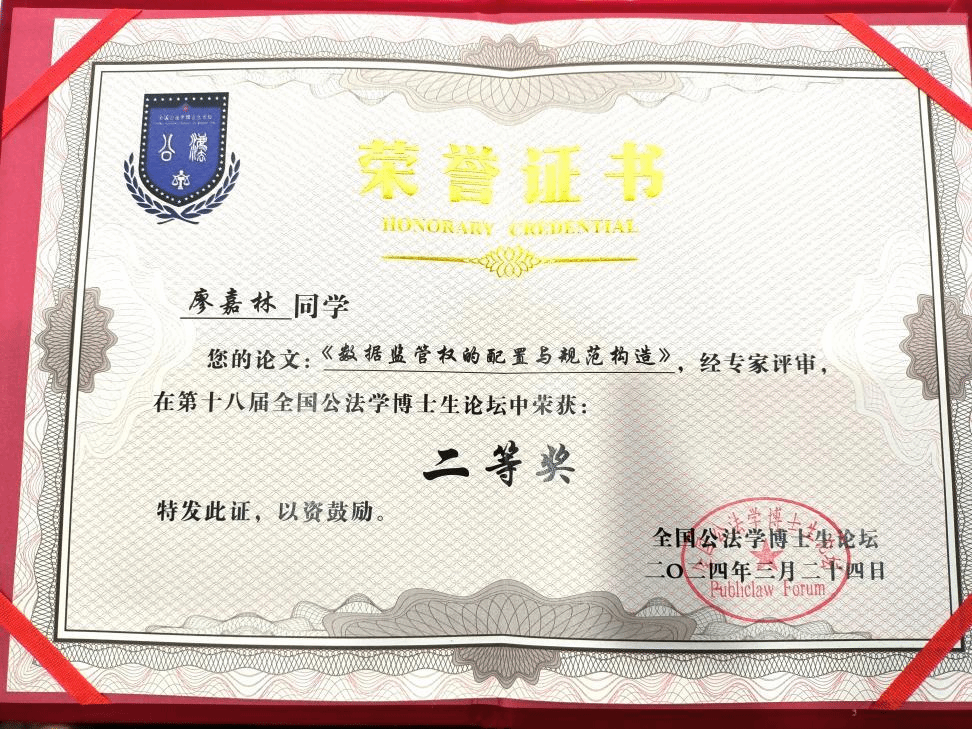 2024年3月23日-24日,第十八届全国公法学博士生论坛在苏州大学举办。本次论坛由苏州大学王健304永利集团官网入口主办,《苏州大学学报(法学版)》编辑部承办,江苏圣典(常州)律师事务所协办。来自304永利集团、北京大学、清华大学、中国人民大学、浙江大学、上海交通大学、山东大学、东南大学、武汉大学、吉林大学、厦门大学、南开大学、中山大学、中国政法大学、中南财经政法大学、郑州大学、西南政法大学、华东政法大学、中国人民公安大学、苏州大学等高校的20位专家学者和30余位公法学博士生参加论坛。公司刘权教授指导的2023级博士生廖嘉林同学应邀参加论坛并获二等奖。廖嘉林同学参会获得304永利集团研究生学术交流支持计划的资助。