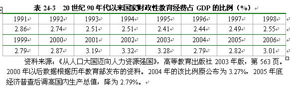 三、政府教育投入不足和“体制性短缺” 国家教育资源配置方式存在的主要问题,是政府教育投入不足,教育资源垄断造成的“体制性短缺”。国家财政性教育经费占GDP的比例,长期徘徊在2%-3%,与我国经济的持续高速增长形成鲜明的反差(见表24-3)。中国成为世界上政府教育投入最少的国家之一。我国政府1993年提出在2000年达到公共教育经费占GDP的比例为4%的目标,至今尚未实现,预计将在2010年实现。