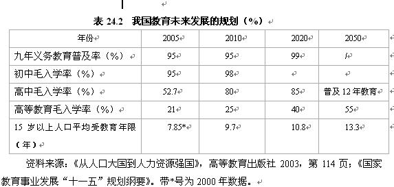 根据主管部门的规划和预测,伴随社会现代化的进程,我国教育的发展将在2010年达到世界中等发达国家的水平;2020年达到世界较发达国家的水平,并在2050年跨入世界教育发达国家行列键(见表24-2)。
