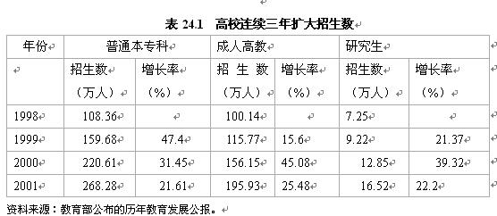 1999年初,在亚洲金融危机、国内市场低迷的背景下,从拉动内需的角度出发,国务院决定高等公司大规模扩招,并提出“高等教育大众化”的目标。1998年,普通高校共招收本专科员工108.36万人,研究生7.25万人。从1999年起,连续三年大规模扩大招生,年增幅平均达30%左右,为历史所罕见。详见表24.1。