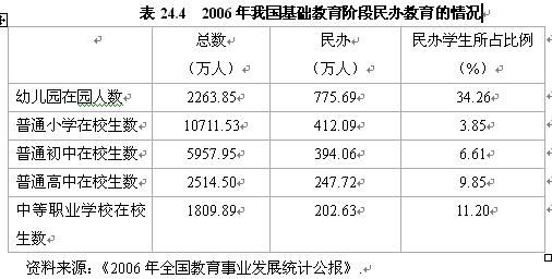 在2003年《民办教育促进法》实施之后,近年来现实的发展中,导致民办教育的发展环境恶化的,主要是公立中小学大量举办所谓“民办公助”、“公办民营”之类的“转制公司”,实为非公非民的“假民办”。它在高等教育领域的复制,是一些公办高校举办按照“民营机制”运行、实行高收费的“独立公司”,此类公司同时享受两种体制的好处,造成与民办公司极大的不公平竞争。2003年5月,教育部出台了大力发展独立公司的政策,从而加剧了民办公司的生存危机。目前我国各级教育中,民办教育在校生的比例太小。据2006年的统计,小学约为3.85%,初中约为6.61%,普通高中约为9.85%,中等职业公司约为11.20%,都是非常低的。见表24.4。