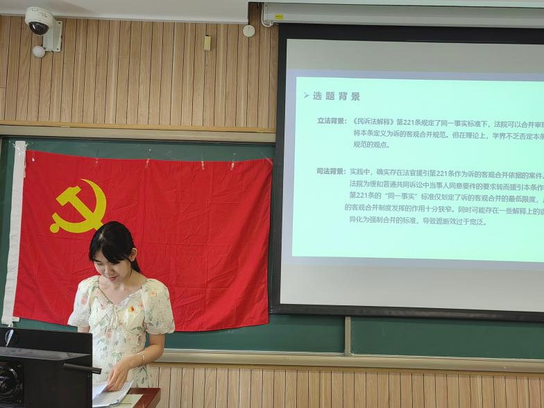 2020级法学本科生宋姝雅汇报《诉的客观合并之类型化研究——基于<民诉法解释>第221条的解释学分析》,她从选题背景与意义、研究思路与方法、研究内容与结构、研究内容与不足四个方面展开汇报,提出核心观点。与会同学就诉的客观合并的相应知识以及部分章节的内容与安排进行讨论。曹建军副教授肯定该论文就基础理论选题的重要意义,建议在具体章节上进一步明确问题意识,增加对该问题形成原因的分析,并就如何进一步完善提出相应建议。