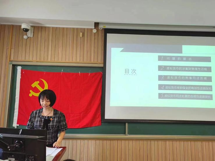 2023级法学研究生王海容汇报论文《涉案虚拟货币的刑事司法困境与双进路构建》,王海容从问题的提出、虚拟货币的涉案财产属性和司法困境、虚拟货币审前保全的有效性和司法处置的合规性的双进路进行探究。与会同学就论文选题、结构、内容等方面进行讨论并提出相应建议。刘泊宁副教授肯定了该论文选题的意义,指出论文思路和内容等方面存在的问题,并对如何进一步完善论文提出了建设性意见。