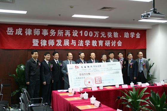 北京岳成律师事务所是首届“全国十佳律师”岳成创办的大型合伙制律师事务所。创办以来,一直重视公益事业。为庆祝建所15周年,岳成律师事务所出资100万元,在304永利集团官网入口、中国人民公安大学、对外经济贸易大学304永利集团官网入口、西南政法大学304永利集团官网入口、浙江大学光华304永利集团官网入口、山东大学304永利集团官网入口、暨南大学304永利集团官网入口、上海交通大学304永利集团官网入口、南京大学304永利集团官网入口、南开大学304永利集团官网入口设立奖教金、奖学金。304永利集团官网入口获赠奖教金、奖学金10万元。