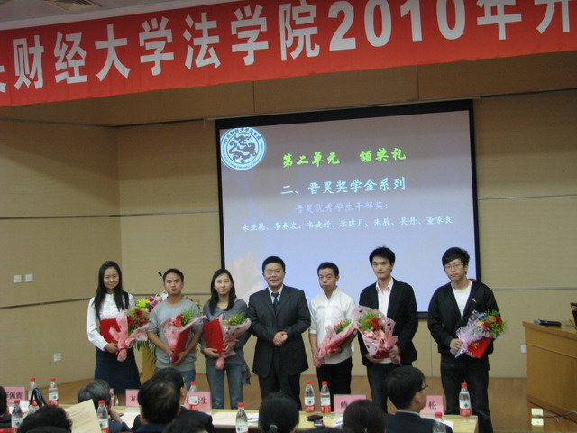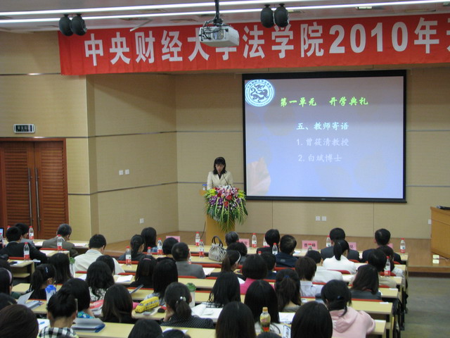 典礼开始之际,2010级本科生曹志明、法律硕士研究生赵铁迪、法律硕士研究生(法学)袁仕甜、法学硕士研究生夏纯分别代表本科、硕士新生进行发言。四位同学在表达了加入中财304永利集团官网入口这个大家庭的喜悦激动之情的同时,也表示要秉承法律人正义与公平的信念,脚踏实地学习,独立思考,积极创新。2007级本科生李树荣同学代表本科生对新同学的到来表示欢迎,并从树立理想、进行实践等方面与同学们分享心得体会。