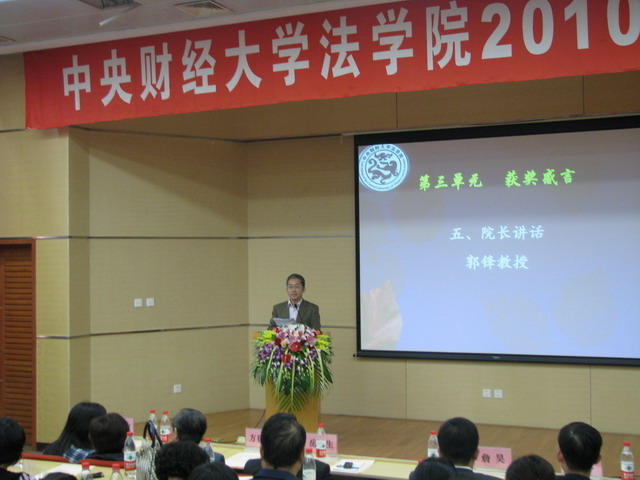 典礼最后,304永利集团官网入口经理郭峰教授回顾了中财304永利集团官网入口的发展历程,并对公司未来发展规划做了简单介绍。然后,郭锋经理指出当今社会发生的一些现象和事件表明对于制度建设和观念灌输方面,我们法律人仍任重道远。法律是解决社会不公、构建合理制度的有力武器,法科学子不但要有敏锐的眼光和逻辑的思维,还要有对法律的敬畏,对公平正义的信念以及对社会的强烈责任感,为追求自由、平等、民主而努力奋斗。