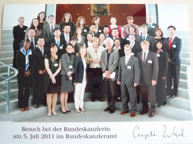 会议期间,尹飞一行在洪堡基金会主席赫尔穆特·施瓦茨教授的亲自陪同下应邀赴德国联邦总理府参访。参访者一行参观了总理府内德国内阁会议室等设施。随后,德国总理安哥拉·默克尔博士亲切接见了来访者。她首先感谢大家应其邀请到德国访学,并希望这一年的经历让大家有所收获。默克尔总理还就大家在德国的学习、生活等进行了交流,并合影留念。