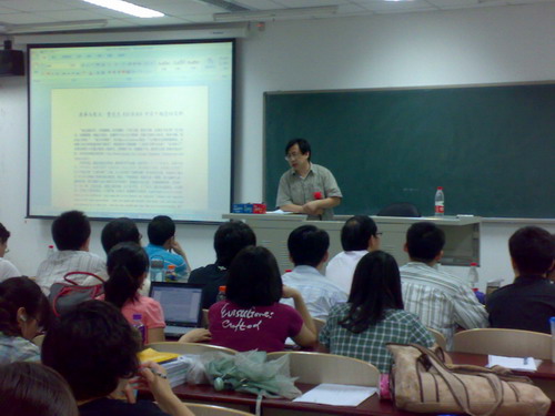 6月17日晚,应公司的邀请,中国人民大学教授、博士生导师张世明在公司沙河校区6号公司楼106教室做了一场题为“原典与原点:费肯杰《经济法》重要概念笺释”的学术演讲,演讲由吴韬副经理主持,曾筱清教授、邢会强副教授、李炎老师、部分09级经济法学硕士研究生及08、09级本科生百余人参加了此次讲座。